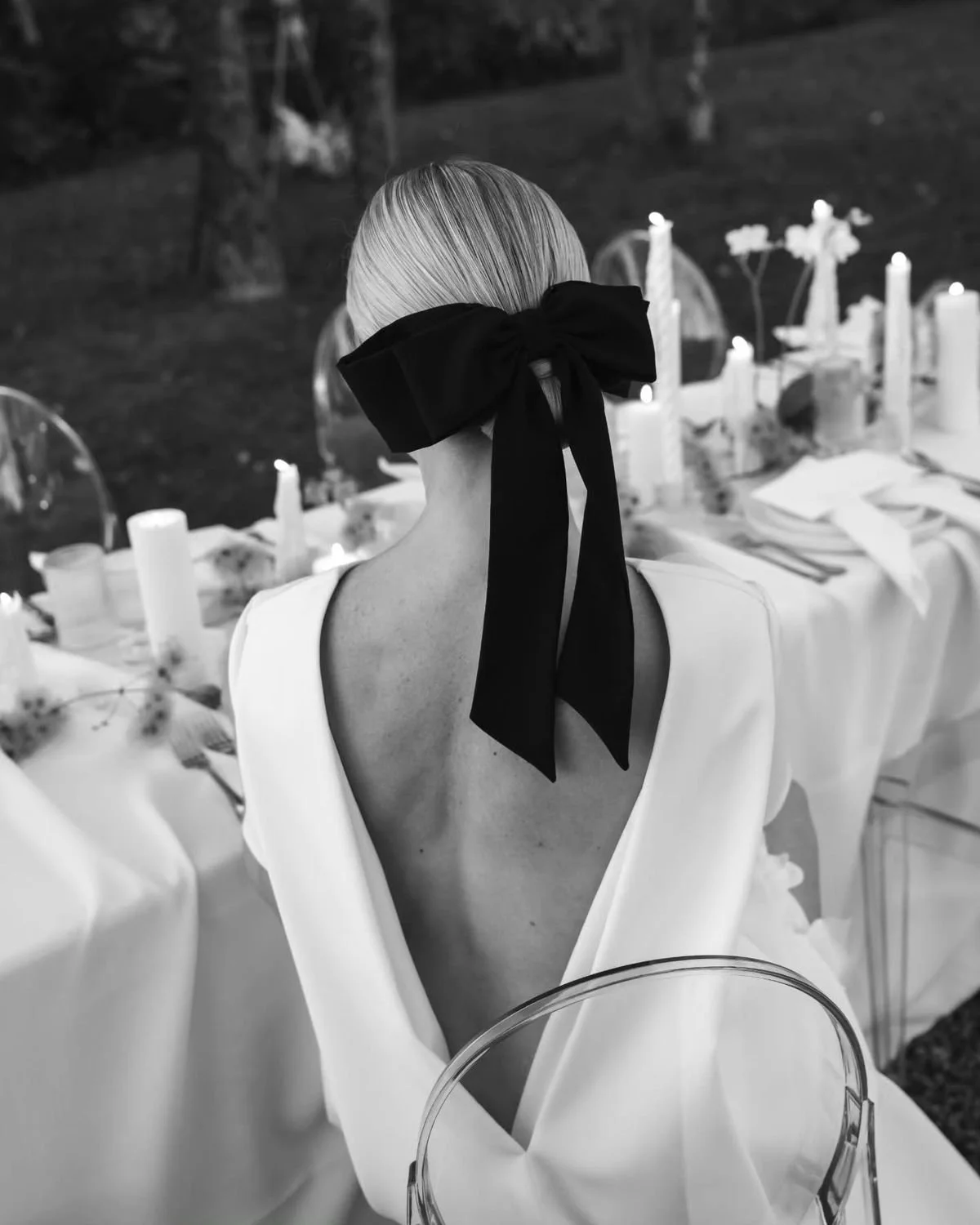 The key to using black in a wedding look is intention. When repeated thoughtfully — perhaps in a satin bow, a black onyx ring, and a ribbon-tied bouquet — it reads as curated rather than accidental. Texture matters: matte satin, brushed metal, velvet, enamel, and black pearls all soften the impact while maintaining sophistication. Against silk, tulle, or crepe, black creates a visual pause that elevates rather than disrupts.